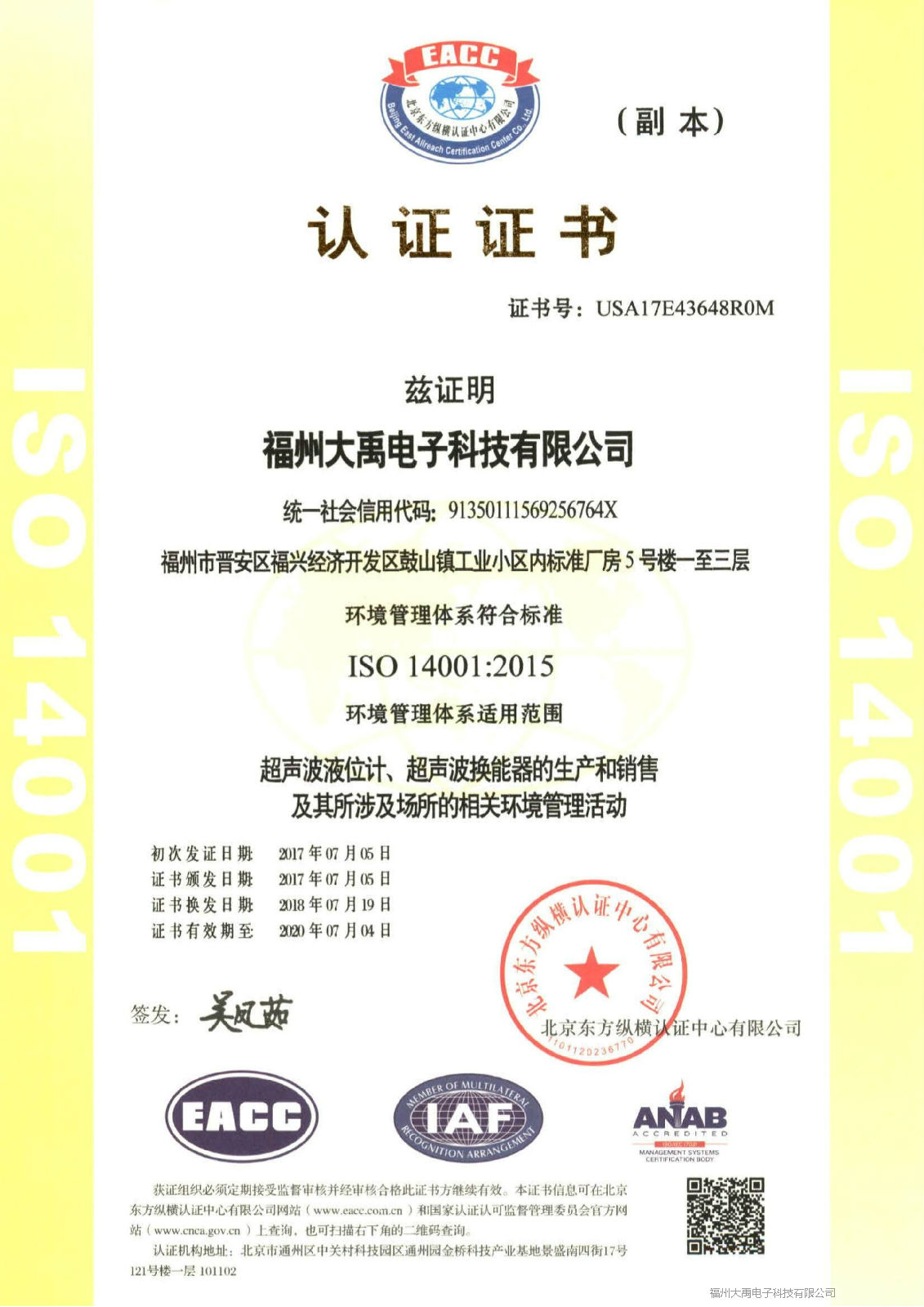 2018年7月,福州大禹電子科技有限公司再次通過了 ISO09001:2015質(zhì)量管理體系認(rèn)證和ISO14001:2015環(huán)境管理體系認(rèn)證,這兩項(xiàng)認(rèn)證標(biāo)志著福州大禹電子科技有限公司的競(jìng)爭力又上了一個(gè)新的臺(tái)階。