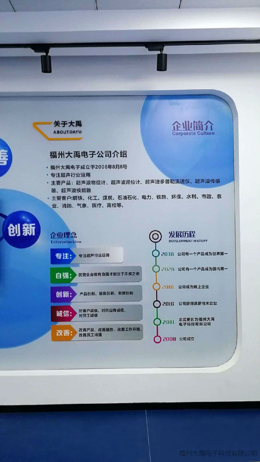 2018是個好年頭,習(xí)大大常說:讓美好愿景變?yōu)楝F(xiàn)實(shí)?,F(xiàn)在,大禹電子實(shí)現(xiàn)了許久以來我們這些超聲波大禹人的美好理想及追求。自2016年大禹電子被評為福建省高新技術(shù)企業(yè)以來,通過我們堅持不懈的努力,公司又開發(fā)了近幾十款新型的換能器及高品質(zhì)的超聲波液位計新款,以及超聲波多普勒流量計小型流量計。近來,新的展廳也順利完成!分別展出本公司生產(chǎn)的眾多超聲波產(chǎn)品系列。