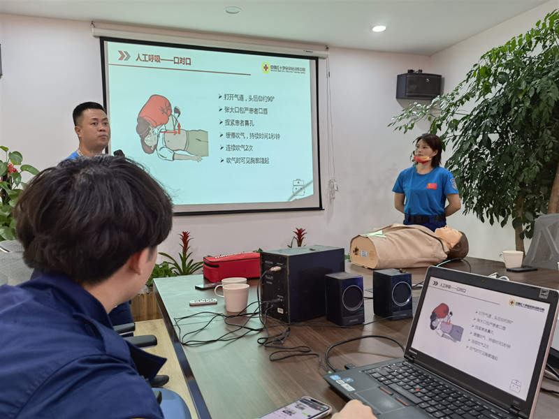 理論講解結(jié)束,再利用急救模型道具,現(xiàn)場示范模擬心肺復蘇、人工呼吸、AED操作步驟、海姆立克急救法等操作流程,理論與實踐相結(jié)合,讓大家能夠更好地理解并掌握急救要領。